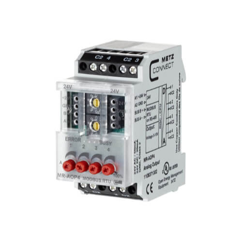 4 analog çıkışlı Modbus modülü, merkezi olmayan anahtarlama görevleri için geliştirilmiştir. Örneğin elektrikli havalandırma ve karışım vanaları, vana konumları vb. için kontrol değişkenleri için kodlayıcı olarak uygundur. Çıkışlar, bir Modbus master aracılığıyla standart kayıtlar aracılığıyla verilebilir. Her çıkış, ön taraftaki 4 potansiyometre vasıtasıyla otomatik veya manuel çalışma için ayarlanabilir. Modül adresi, bit hızı ve parite, öndeki 2 döner anahtarla veya yazılımla ayarlanır. Elektrik dağıtım panolarında IEC 60715’e göre DIN TH35 rayına merkezi olmayan montaj için uygundur.
