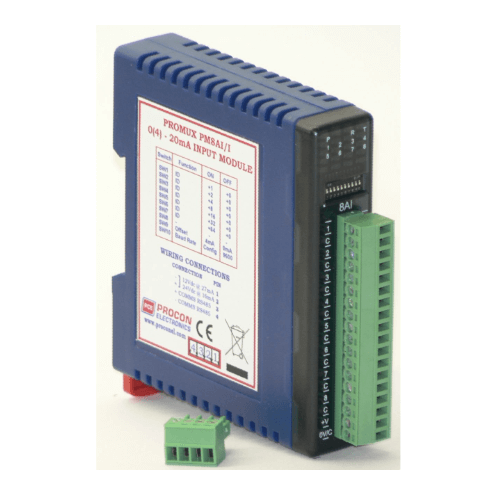 PM8AI/I, 8 kanallı bir akım giriş modülüdür. Girişler mantıktan yalıtılmıştır ve ortak bir negatif terminali paylaşır.