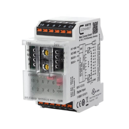 10 dijital girişli Modbus modülü, merkezi olmayan anahtarlama görevleri için geliştirilmiştir. Havalandırma valflerindeki elektriksel limit anahtarları veya güç kontaktörlerinin yardımcı kontakları gibi potansiyelsiz anahtar durumlarını tespit etmek için uygundur. Girişler kontak veya gerilim girişi olarak kullanılabilir. Girişler, bir Modbus master aracılığıyla standart kayıtlar aracılığıyla taranabilir. Modül adresi, bit hızı ve parite, öndeki 2 döner anahtarla veya yazılımla ayarlanır. Elektrik dağıtım panolarında IEC 60715’e göre DIN TH35 rayına merkezi olmayan montaj için uygundur.
