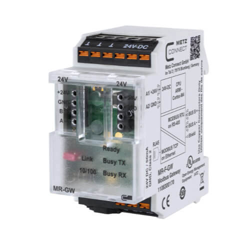 MR-(F)-GW kompakt bir Modbus RTU / Modbus TCP Ağ Geçididir. MR-Ağ Geçidi, Modbus RTU fieldbus cihazları ile bir Modbus TCP ana bilgisayarı (istemci) arasında çift yönlü veri alışverişini mümkün kılar. MR-(F)-GW iki modda çalıştırılabilir. Modbus RTU over TCP modunda şeffaf bir ağ geçidi olarak veya bir protokol dönüştürücü (Modbus TCP modu) olarak. MR-Gateway, METZ CONNECT Modbus RTU cihazlarına, cihazın ön tarafındaki iki adet 4 kutuplu terminal ve bir köprü fişi aracılığıyla bağlanabilir. İki arayüzün (Ethernet / RS485) parametre ayarları, yönetimi ve izlenmesi için entegre bir web sunucusu kullanılır. Web arayüzü aynı zamanda aygıt yazılımını güncellemek için de kullanılır. MR-Gateway, elektrik alt dağıtım panolarına veya IEC 60715’e uygun olarak TH35 montaj rayları üzerindeki kontrol kabinlerine merkezi olmayan montaj için uygundur.